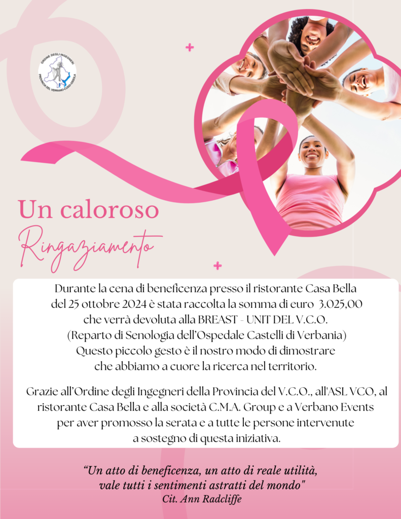 Grazie all'Ordine degli Ingegneri della Provincia del V.C.O., all'ASL VCO, al ristorante Casa Bella e alla società C.M.A. Group e a Verbano Events per aver promosso la serata e a tutte le persone intervenute a sostegno di questa iniziativa.